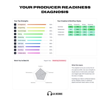 Take the 20-question Producer Readiness Survey trusted by 1,000+ musicians. Get a personalized diagnosis of your strengths, plus a custom 9-page playbook to close your biggest gap.